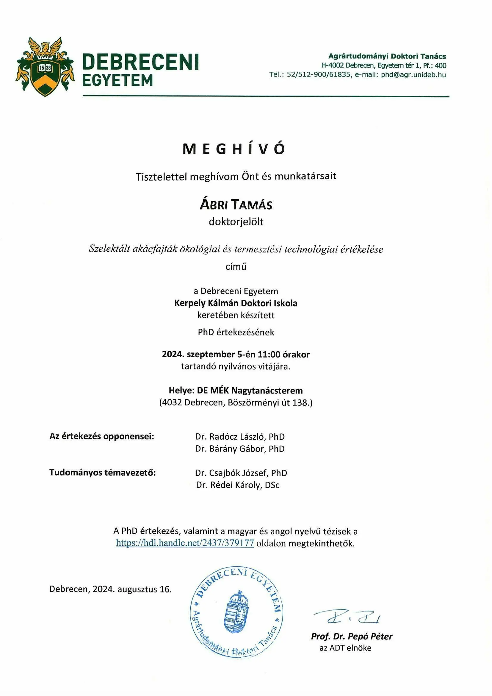2024. 09. 05., cs – 11:00 Tisztelettel meghívom Önt és munkatársait Ábri Tamás doktorjelölt nyilvános vitájára Legutóbbi frissítés: 2024. 08. 23. 10:14