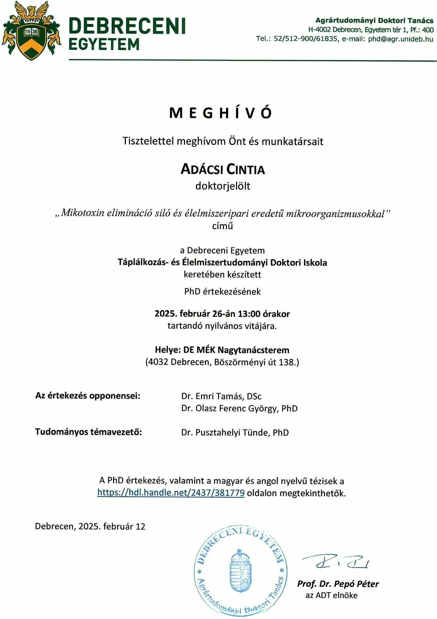 2025. 02. 26., sze – 13:00 Tisztelettel meghívom Önt és munkatársait Adácsi Cintia nyilvános vitájára Legutóbbi frissítés: 2025. 02. 17. 14:44