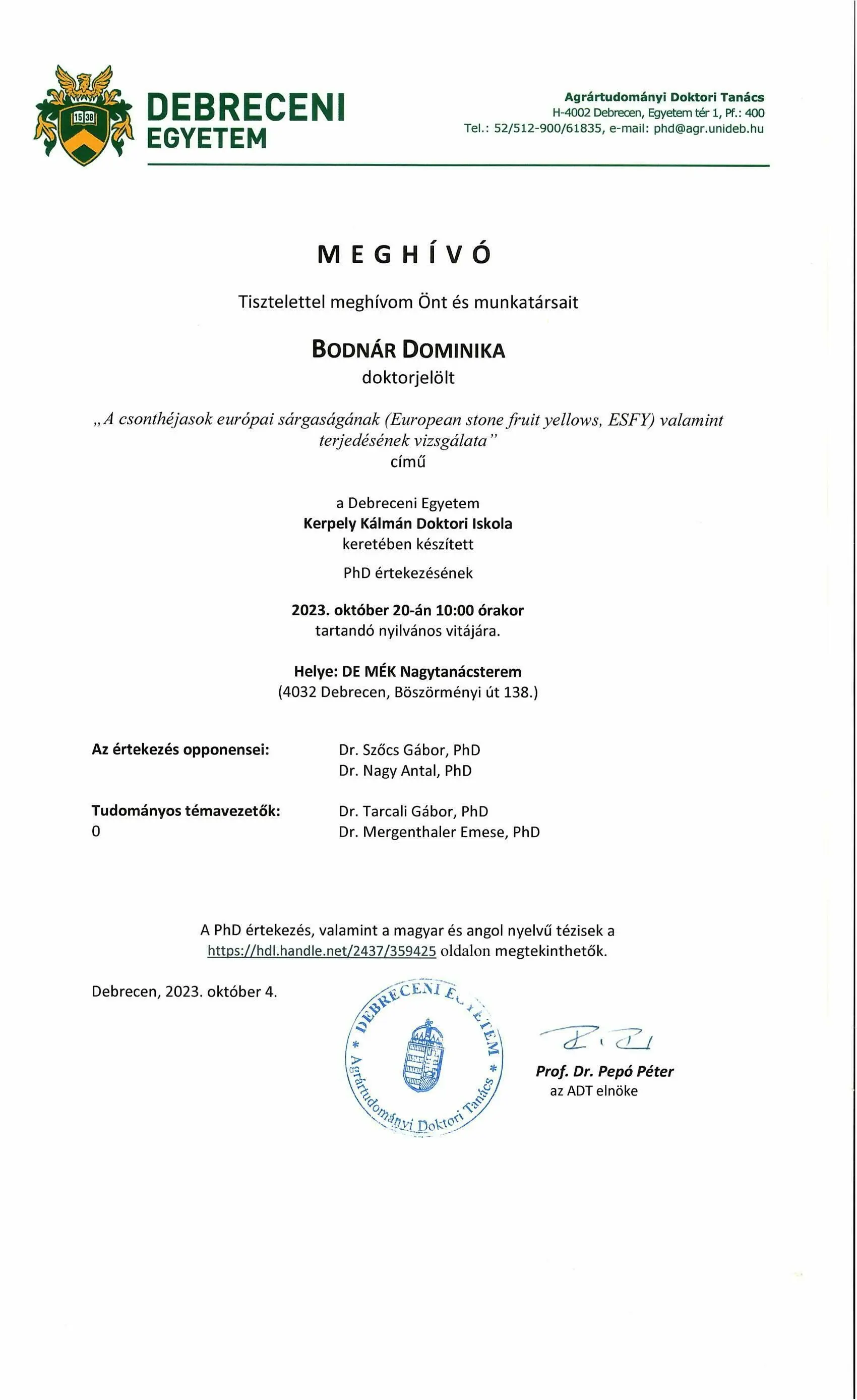 2023. 10. 20., p – 08:00 Tisztelettel meghívom Önt és munkatársait Bodnár Dominika doktorjelölt nyilvános vitájára Legutóbbi frissítés: 2023. 10. 17. 07:57