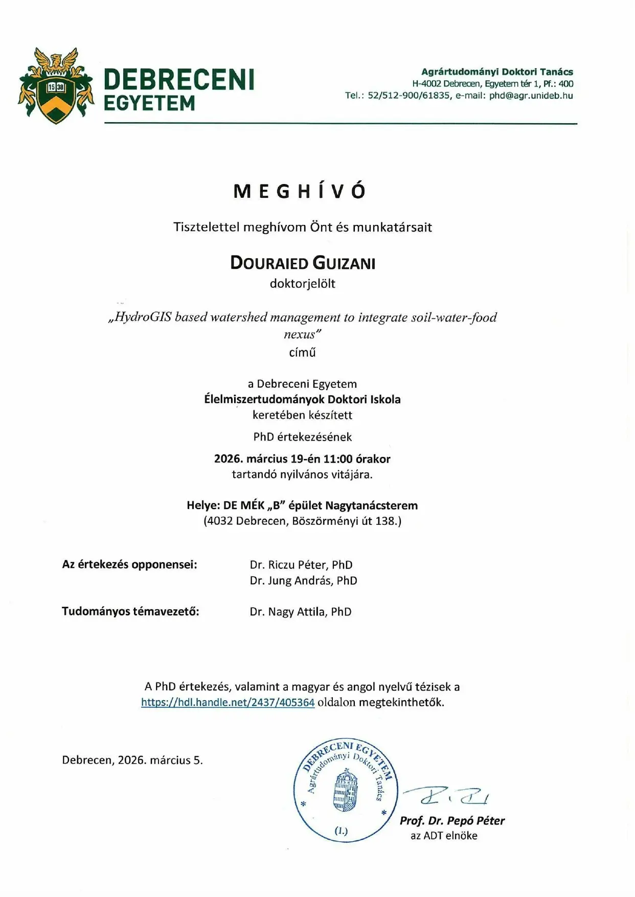 2026. 03. 19., cs – 11:00 Tisztelettel meghívom Önt és munkatársait Douraied Guizani nyilvános vitájára Legutóbbi frissítés: 2026. 03. 13. 12:59