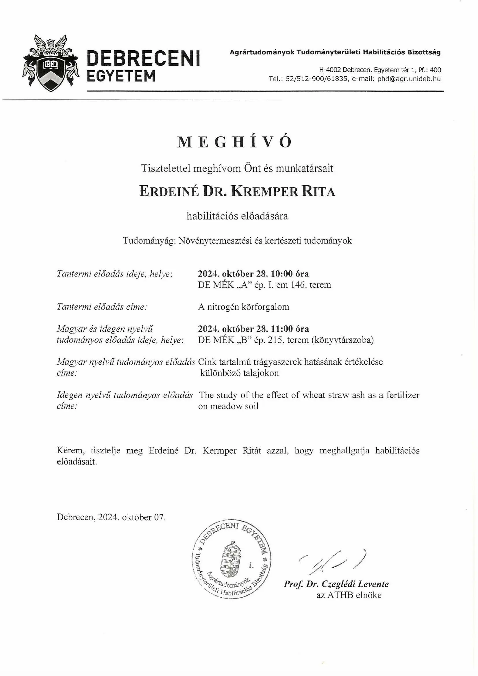 2024. 10. 28., h – 01:00 Tisztelettel meghívom Önt és munkatársait Erdeiné Dr. Kremper Rita habilitációs előadására Legutóbbi frissítés: 2024. 10. 17. 12:01