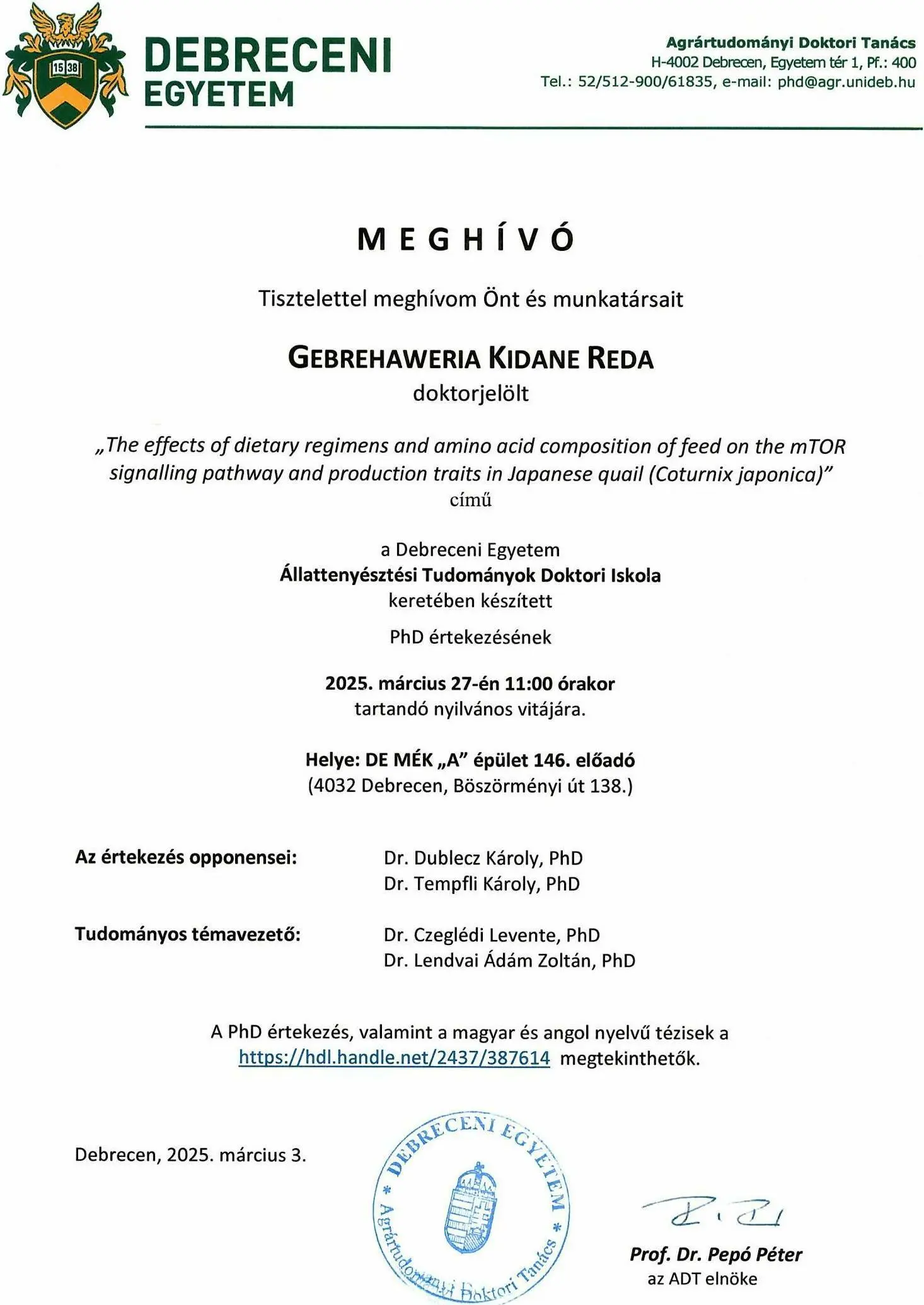 2025. 03. 27., cs – 11:00 Tisztelettel meghívom Önt és munkatársait GEBREHAWERIA KIDANE REDA nyilvános vitájára Legutóbbi frissítés: 2025. 03. 12. 10:47