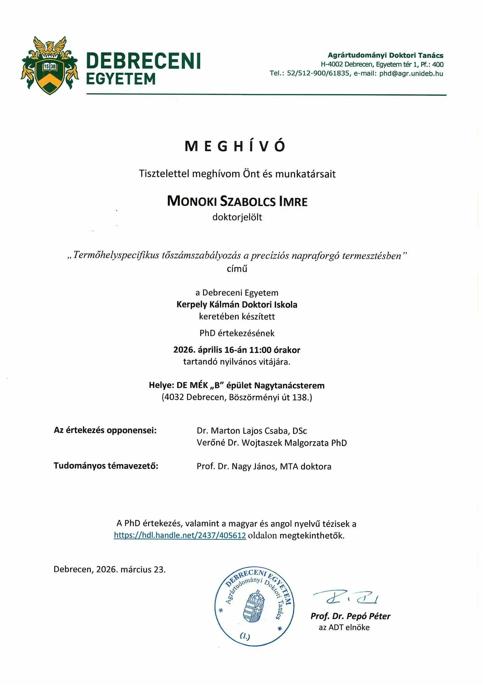 2026. 04. 16., cs – 11:00 Tisztelettel meghívom Önt és munkatársait Monoki Szabolcs Imre nyilvános vitájára Legutóbbi frissítés: 2026. 03. 30. 13:12