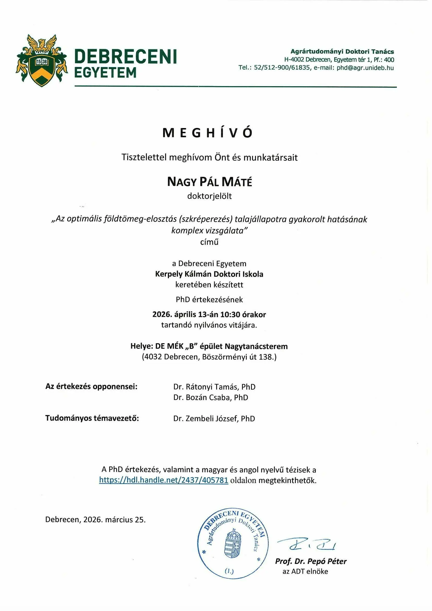 2026. 04. 13., h – 10:30 Tisztelettel meghívom Önt és munkatársait Nagy Pál Máté nyilvános vitájára Legutóbbi frissítés: 2026. 03. 30. 13:13