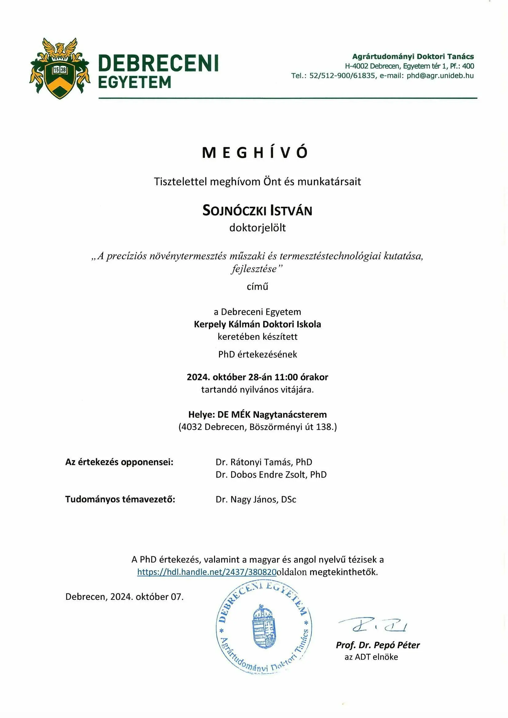 2024. 10. 28., h – 11:00 Tisztelettel meghívom Önt és munkatársait Sojnóczki István nyilvános vitájára Legutóbbi frissítés: 2024. 10. 17. 11:58
