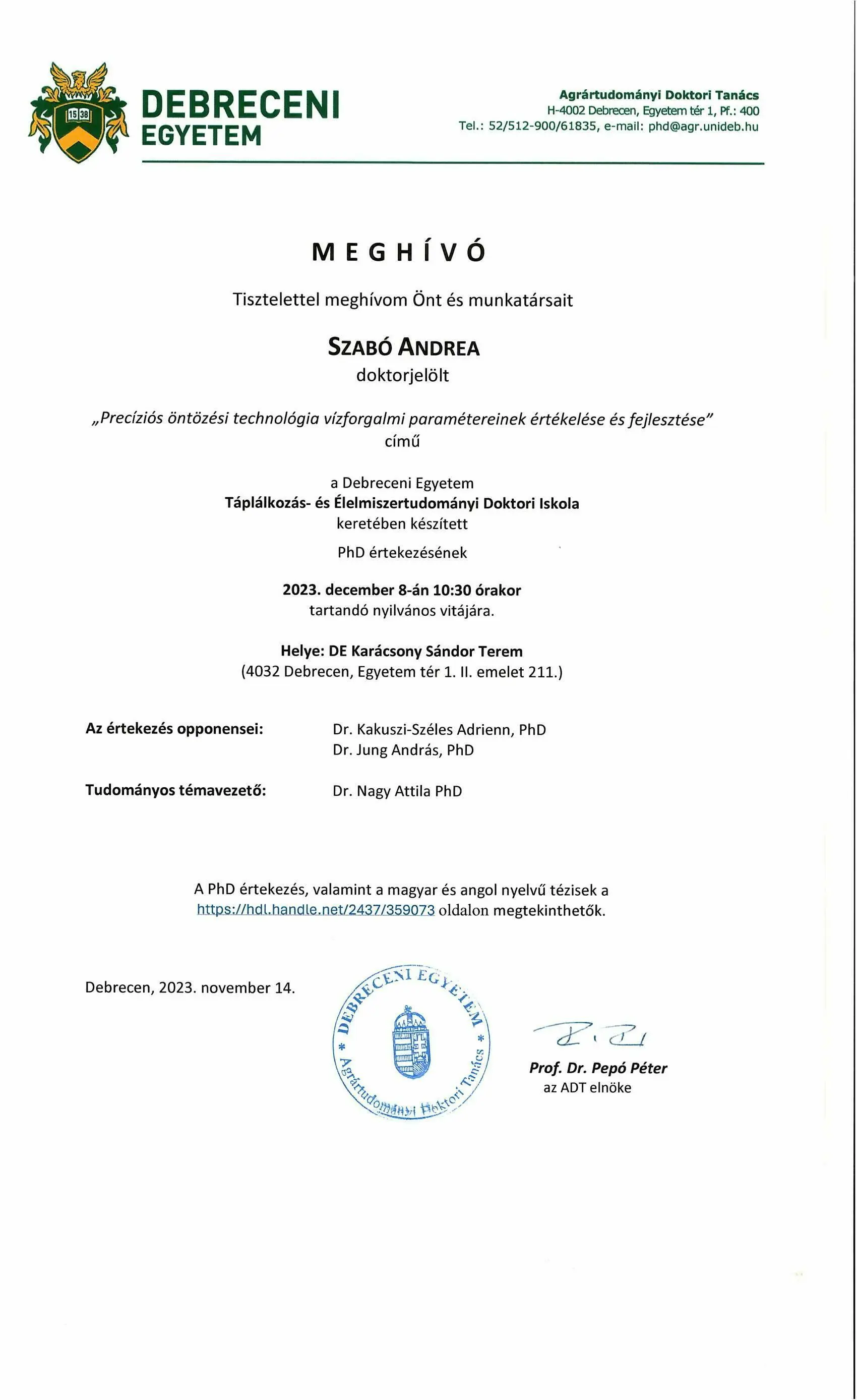2023. 12. 08., p – 10:30 Tisztelettel meghívom Önt és munkatársait Szabó Andrea doktorjelölt nyilvános vitájára Legutóbbi frissítés: 2023. 11. 30. 14:31
