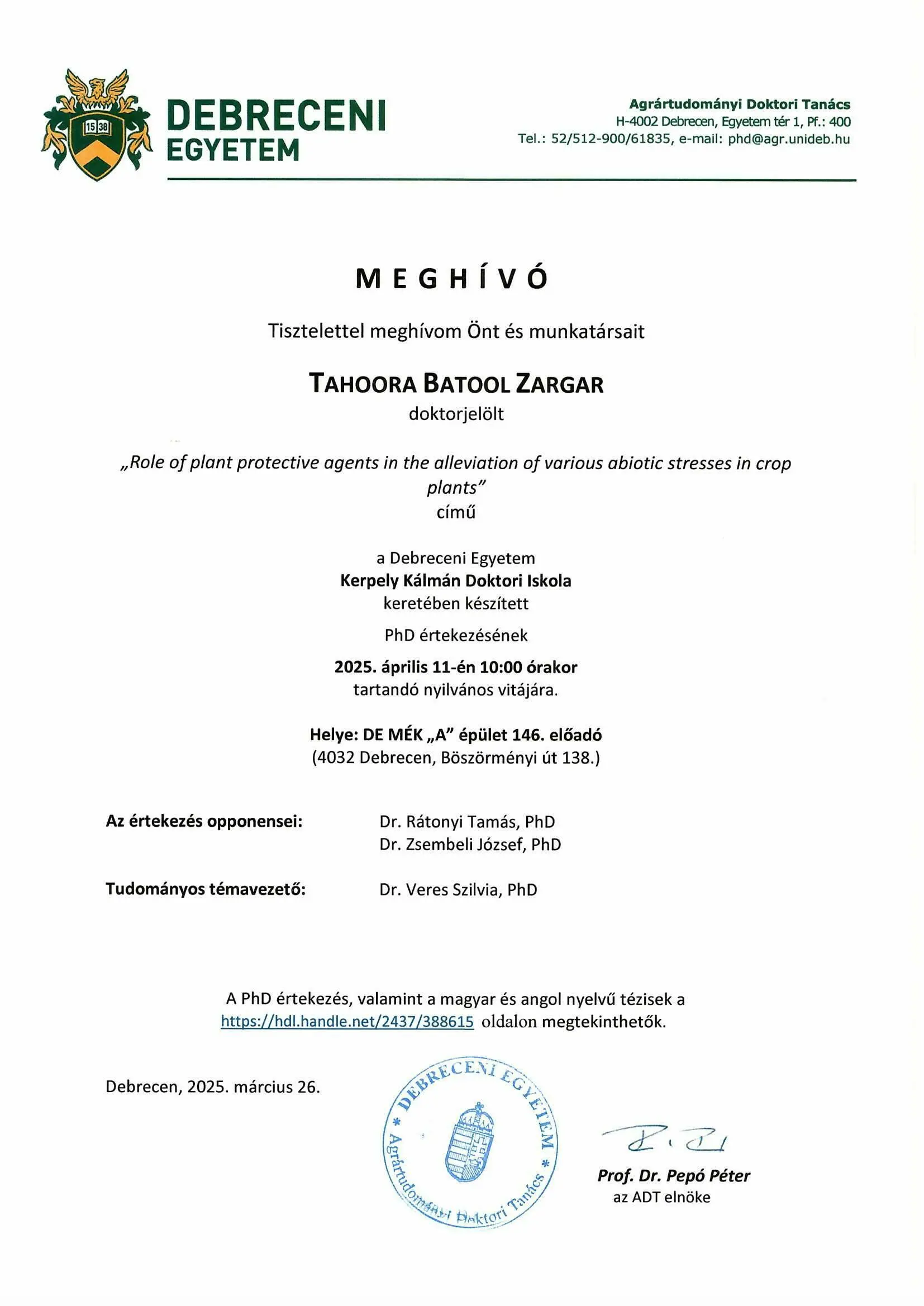 2025. 04. 11., p – 10:00 Tisztelettel meghívom Önt és munkatársait TAHOORA BATOOL ZARGAR nyilvános vitájára Legutóbbi frissítés: 2025. 04. 01. 13:16