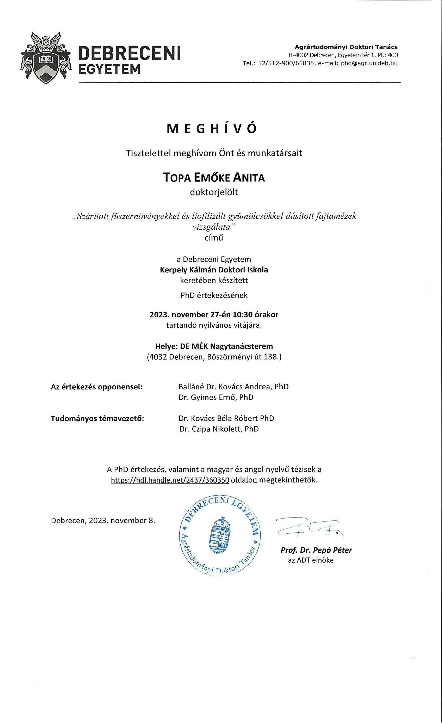 2023. 11. 27., h – 10:30 Tisztelettel meghívom Önt és munkatársait Topa Emőke Anita doktorjelölt nyilvános vitájára Legutóbbi frissítés: 2023. 11. 16. 13:55