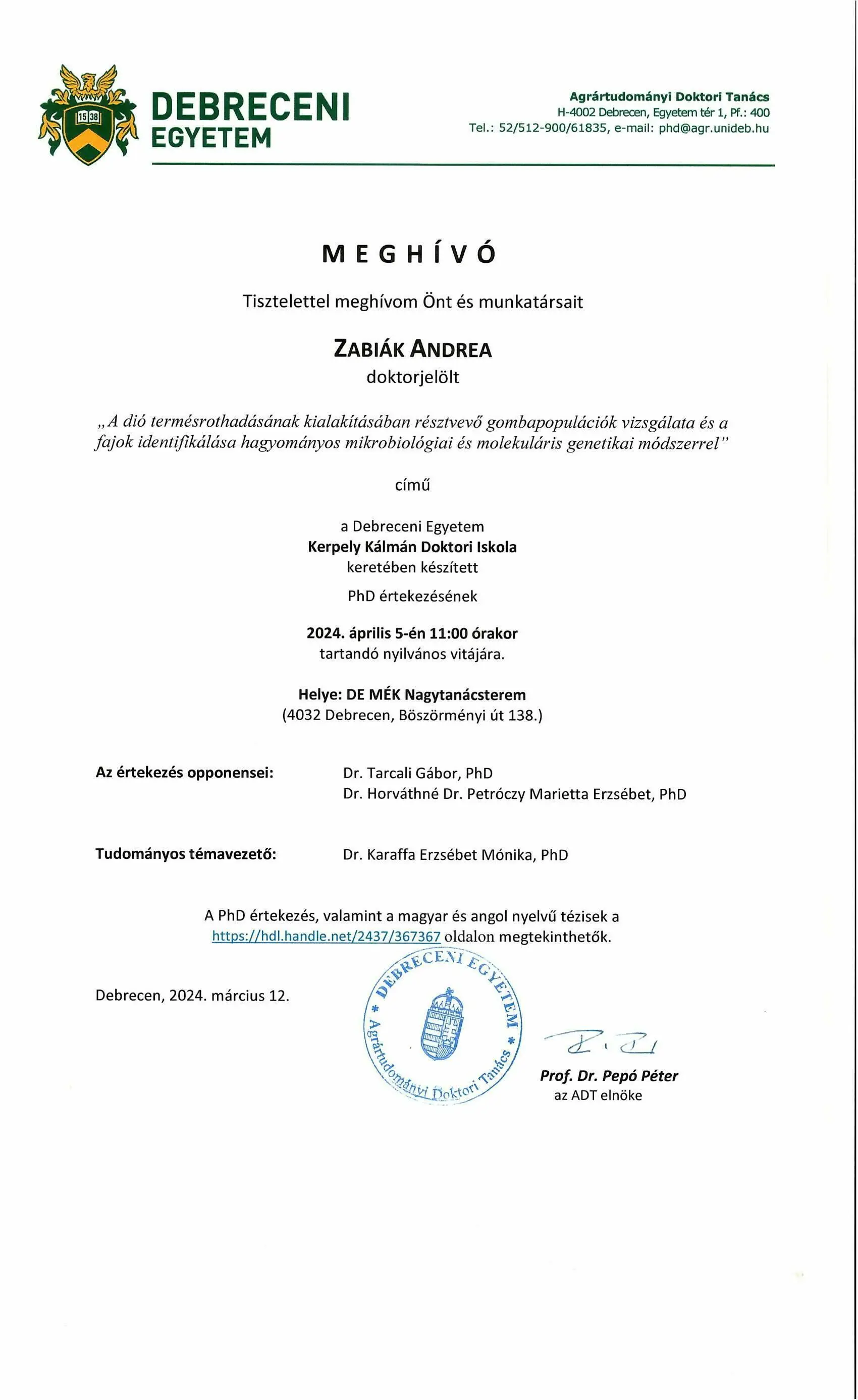 2024. 04. 05., p – 11:00 Tisztelettel meghívom Önt és munkatársait Zabiák Andrea doktorjelölt nyilvános vitájára Legutóbbi frissítés: 2024. 03. 26. 12:13