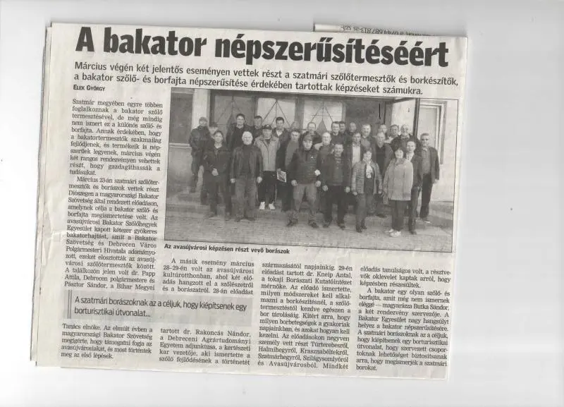 mellyel kapcsolattartónk Butka Sándor, aki igen komolyan kiveszi a részét az egyesület érdekérvényesítéséből és a közösségi élet szervezéséből. Így látogattunk el a Bakator Szövetséghez Avasújvárosra, ahol Rakonczás Nándor adjunktus (MÉK Kertészettudományi Intézet) szakmai továbbképzést tartott. A szakmai és technológiai racionalitások mentén tematikusan áttekintettünk a termékelőállítás eredetvédelemmel kapcsolatos sarokpontjait, mely kérdés megkerülhetetlen. (Korszakunk kritikus tényezői: globalizáció, klímaváltozás, élőmunka hiánya vs. gépesítés, mely utóbbi a terroir-fogalom szempontjából erkölcsileg megsemmisítő érvényű jelenség!!!). Ezen blokk alatt került felszínre a fajtamegválasztás kérdése. A klímaváltozás és a globalizáció folytán egyre tényszerűbb, hogy a rezisztencianemesítés, és a rezisztens szőlőfajták termesztése ki fogja kényszeríteni magát. A történelmi szőlőfajták termesztése és megőrzése természetesen továbbra is fontos cél! Rövid szünet után, a második előadási blokkban a szaporítóanyag előállítás certifikációs rendszerén keresztül rátértünk az oltványelőállítás globális kihívásaira, az ezekből adódó lokálisan jelentkező technológiai hibalehetőségekre és az ültetvénylétesítés kritikus pontjaira. A harmadik előadási blokk - közkérésre szünet nélkül folytatva a gondolatmenetet – a szőlő reproduktív alciklusának/ a szőlőbogyó érésének valamelyest tudományosabb bevezetőjén keresztül világított rá a szüret kritikus pontjaira. Ezen keresztül szó kellett essen a következetesen érintett borászati technológiai kérdésekről: héjon áztatás, malolaktikus fermentáció, fajélesztők alkalmazásáról.