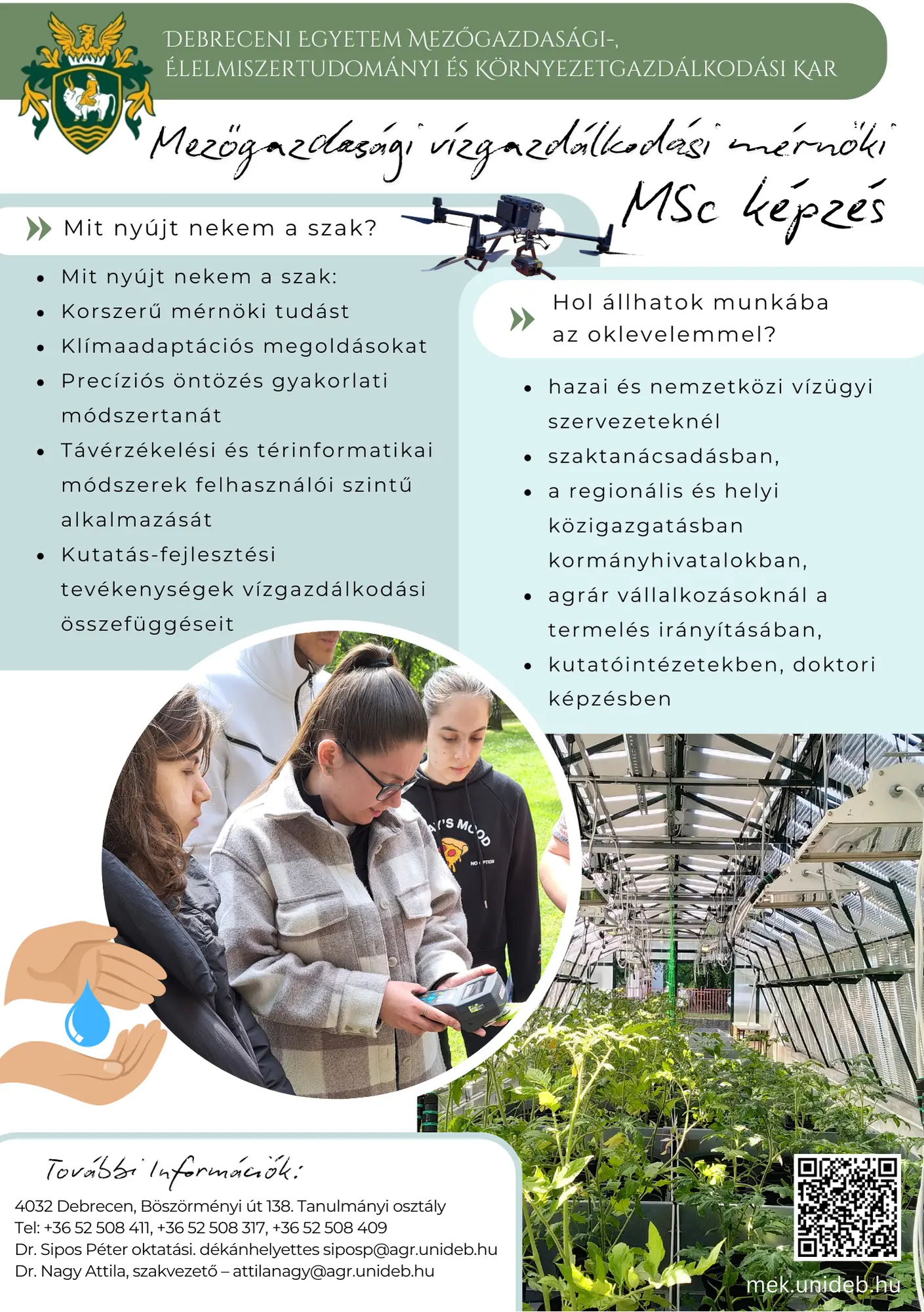 A képzés célja mezőgazdasági vízgazdálkodási mérnökök képzése, akik a mesterképzésben megszerzett ismeretek birtokában képesek a mezőgazdasági vízgazdálkodás szakterületén belül a fenntartható integrált vízgazdálkodás eszközrendszerének kreatív mérnöki alkalmazására. A képzettségük birtokában magas szinten képesek együttműködni szakterületéhez kapcsolódó hazai és nemzetközi feladatok megoldásában. Alkalmasak a tervező-fejlesztő mérnöki, kutatói, illetve vezetői munkakörök betöltésére. Felkészültek tanulmányaik doktori képzésben történő folytatására.