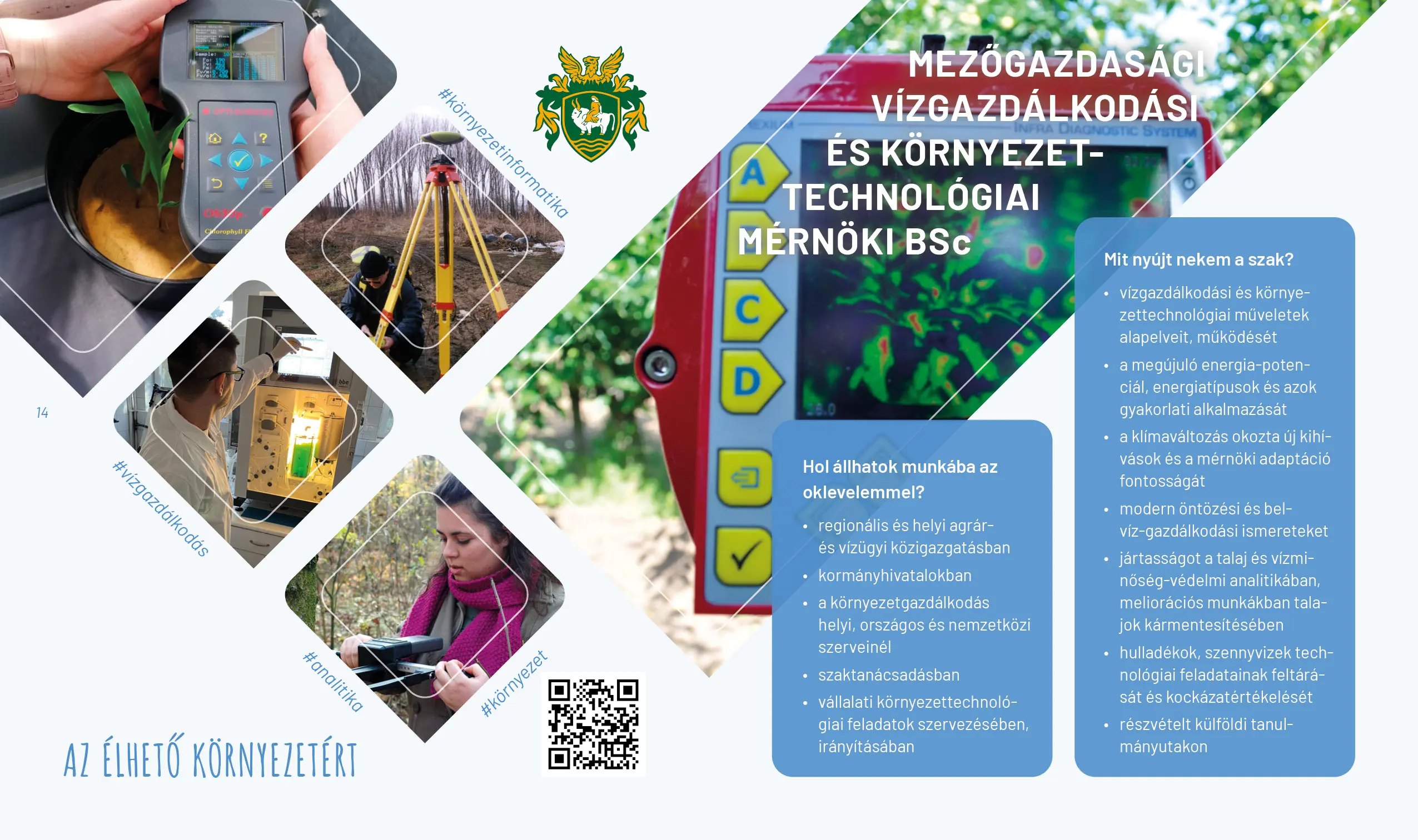 A Mezőgazdaság-, Élelmiszertudományi és Környezetgazdálkodási Karon elsőként 2022 szeptemberében indul Mezőgazdasági vízgazdálkodási és környezettechnológiai mérnöki alapszak. A képzés célja olyan mérnökök képzése, akik képesek a mezőgazdasági vízgazdálkodási és környezettechnológiai folyamatok üzemeltetési feladatainak ellátására, illetve a tervezésében való közreműködésre. Rendelkeznek a fenntartható termelés közvetlen irányításához, a technológiai folyamatok szükség szerinti módosításához, illetve új technológiák bevezetéséhez szükséges ismeretekkel. Ismerik az alkalmazható mezőgazdasági vízgazdálkodási és környezettechnológiákat és eljárásokat, melyek segítségével képesek klímaadaptációs megoldások kidolgozásában való részvételre, annak megvalósítására, szakigazgatási alapfeladatok ellátására, regionális és határokon átnyúló agrár- és környezeti kérdések kezelésére.